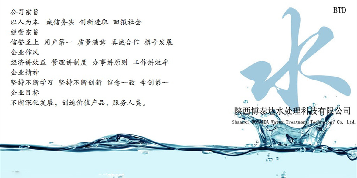 陜西博泰達(dá)水處理科技有限公司是西北一家集銷售、科研開(kāi)發(fā)、安裝和技術(shù)服務(wù)為一體的高新環(huán)保科技型企業(yè)。公司以科技創(chuàng)新為先導(dǎo),全心致力于人類環(huán)境保護(hù)和發(fā)展。以客戶滿意、打造完善服務(wù)為遵旨,為廣大用戶提供優(yōu)質(zhì)的水處理設(shè)備和空氣凈化系統(tǒng)。